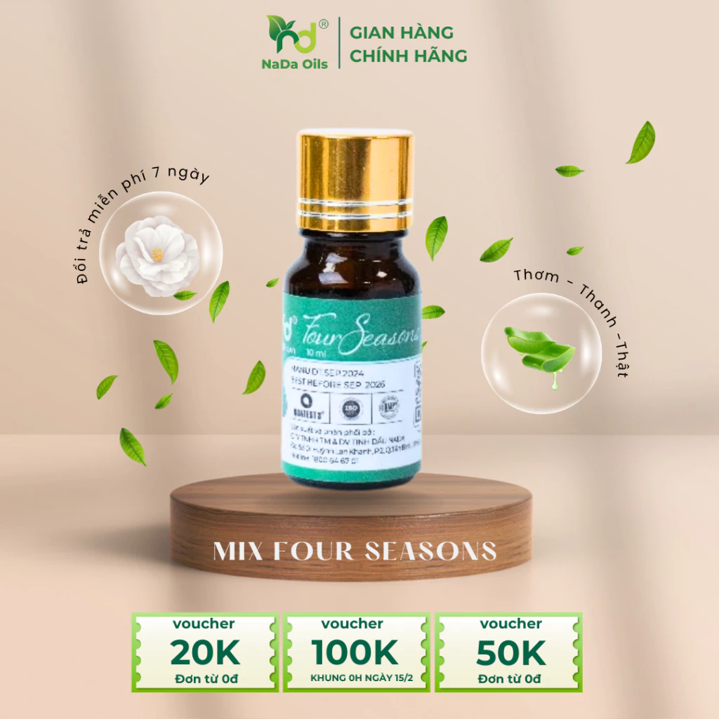 Khi nói đến sự cân bằng trong nghệ thuật hương thơm, không thể bỏ qua tinh dầu Mix Độc Quyền Four Season – dòng sản phẩm mang triết lý “hòa hợp bốn mùa trong một mùi hương”. Four Season được phát triển dựa trên sự kết hợp tinh hoa từ ba dòng nổi bật của NaDa Oils: Energy tràn đầy năng lượng, Garden nhẹ nhàng nữ tính và Fresh tươi mới thanh khiết. Tất cả được phối trộn theo công thức độc quyền, tạo nên một tổng thể hương thơm hài hòa, phù hợp với mọi thời điểm trong năm.